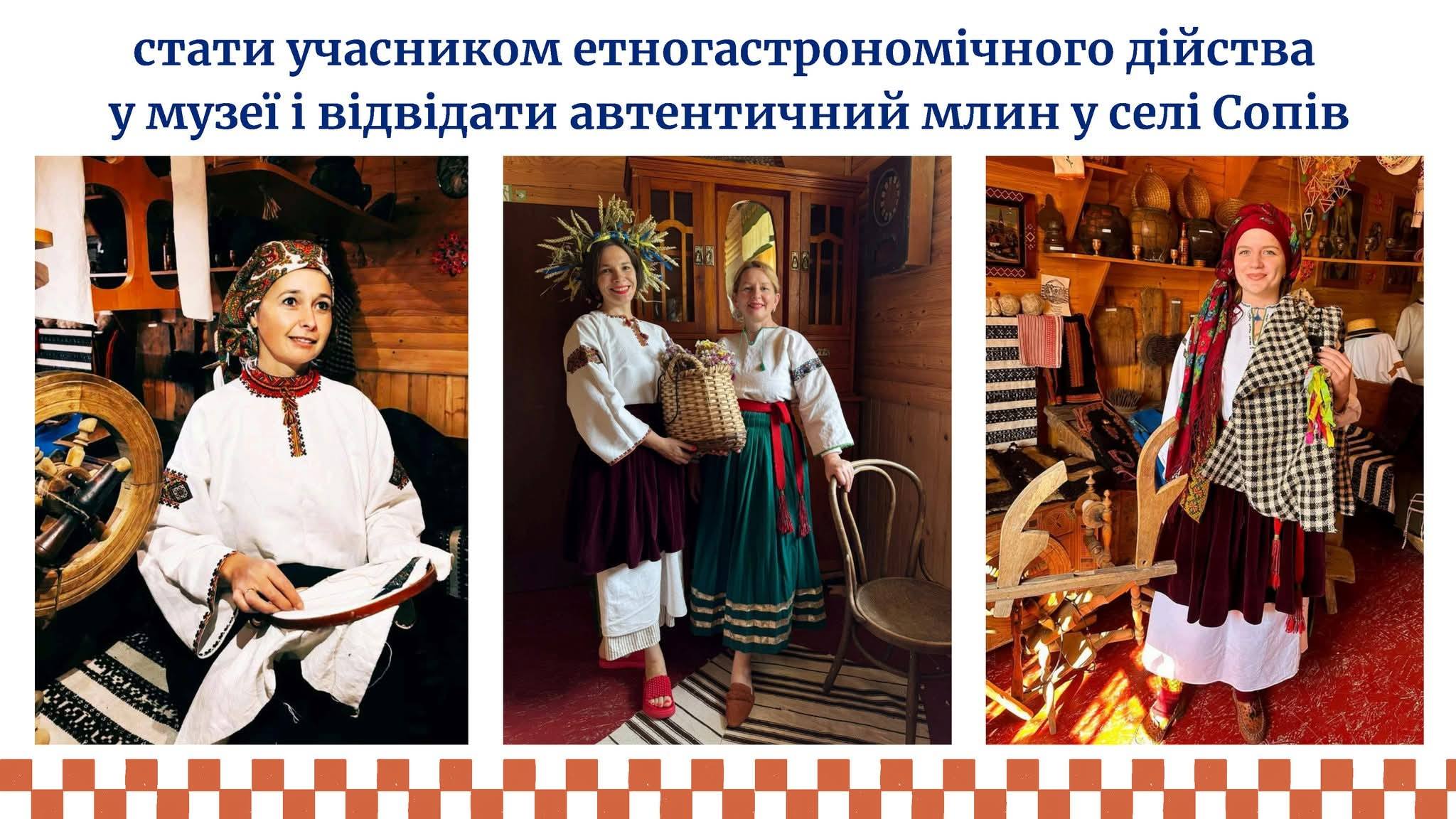 До маршруту включено і село Сопів, де туристи мають змогу стати учасниками етногастрономічного дійства у музеї та відвідати автентичний млин, відчувши справжню атмосферу покутського побуту та традицій.