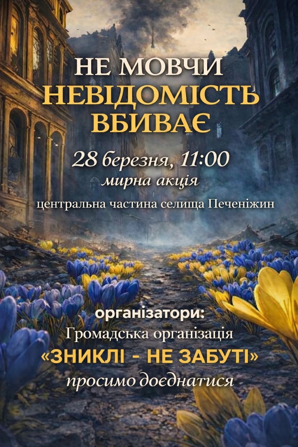 28 березня об 11:00 у центральній частині селища Печеніжин, у районі парку Т. Г. Шевченка, відбудеться мирна акція на підтримку зниклих безвісти, полонених захисників та їх родин.
