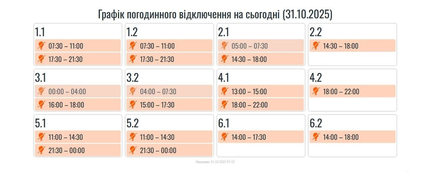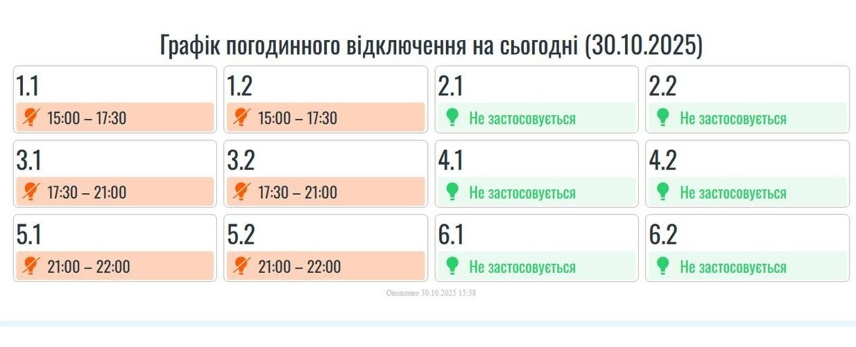 Графік погодинного відключення на сьогодні (30.10.2025)