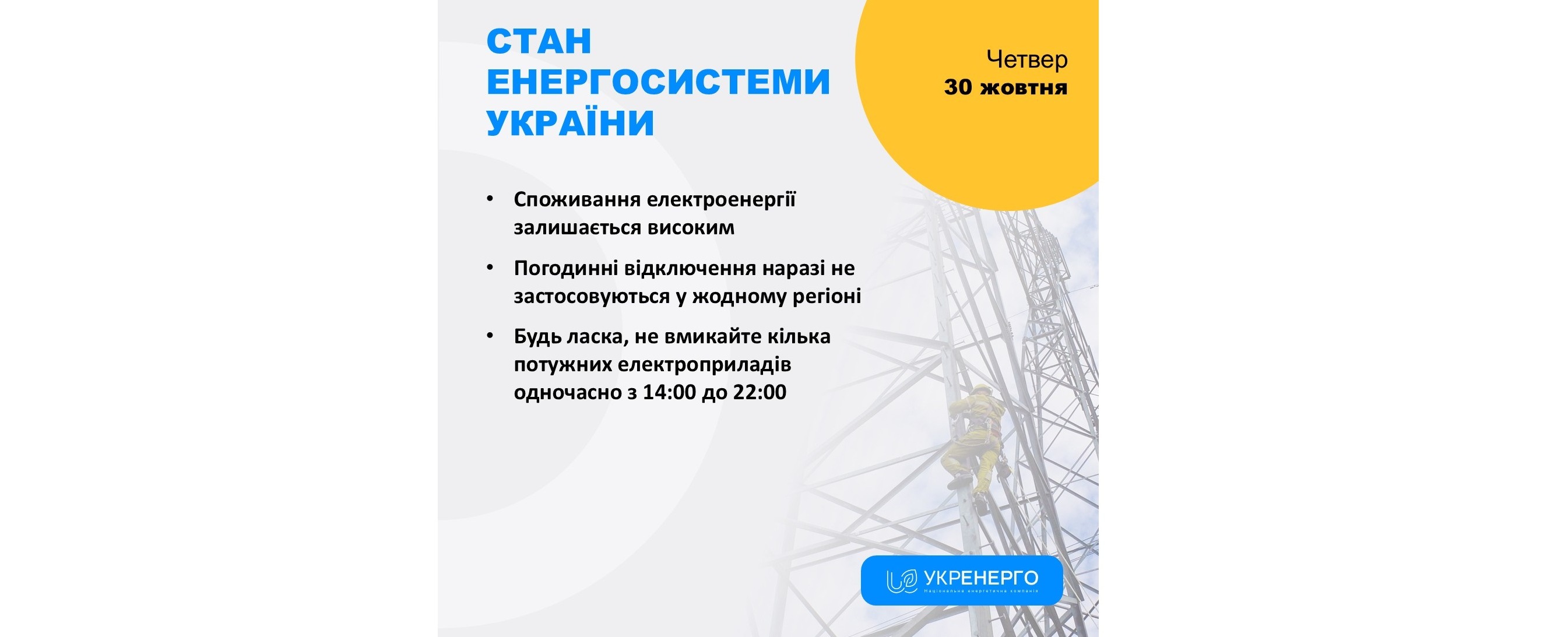 Увага! Ситуація в енергосистемі може змінюватись. Стежте за повідомленнями на сайтах та офіційних сторінках у соцмережах вашого оператора системи розподілу (обленерго)